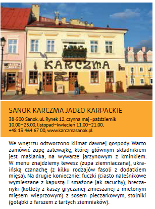 Rozpoczynając przygodę z Bieszczadami pierwszym punktem programu jest zwiedzanie urokliwie położonego nad brzegiem Sanu Muzeum Budownictwa Ludowego w Sanoku. Jest to największe pod względem ilości zgromadzonych obiektów muzeum na wolnym powietrzu w Polsce. Spokojnie można tu spędzić parę godzin. Po intensywnym zwiedzaniu skansenu można usiąść w klimatycznej karczmie, przy sanockim rynku i zakosztować regionalnych smaków. Po posiłku warto odwiedzić muzeum historyczne mieszczące się na Zamku Królewskim.